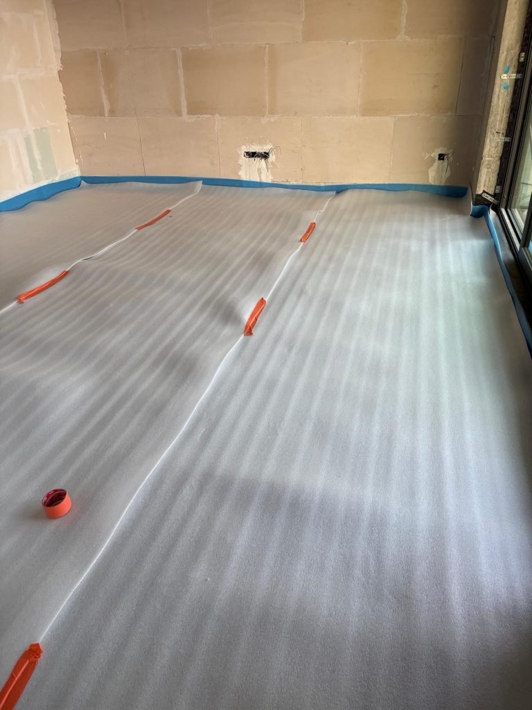 Het is een speciale isolatielaag die geluid dempt en contactgeluid, zoals voetstappen of schuivende meubels, vermindert. Ook luchtgeluid tussen verdiepingen wordt beperkt, voor een comfortabeler en rustiger interieur.